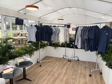 Guests can browse and try on a selection of products, selecting their preferred items. Purchases can be shipped directly to their home or placed in their club locker - they can also be embroidered. Their dedicated team handles setup, guest support, and pack-down.